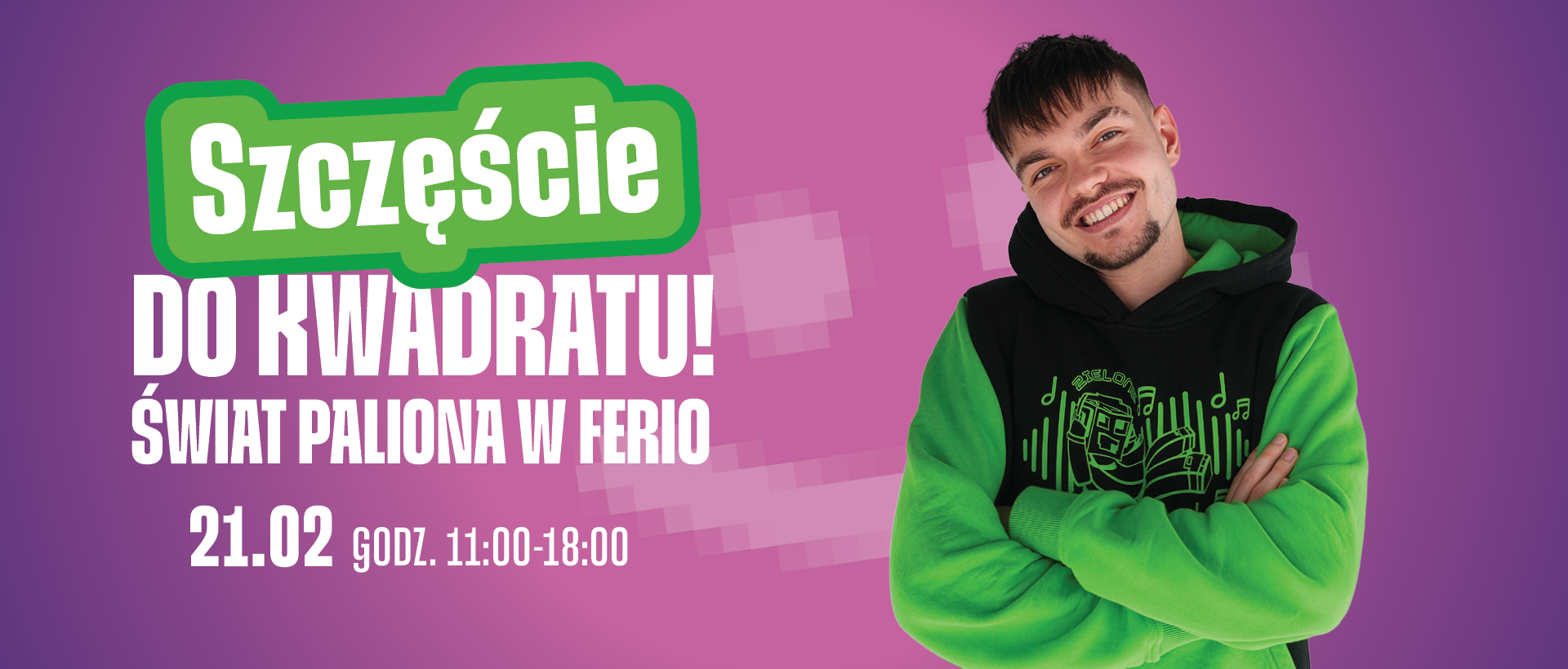 W sobotę, 21 lutego, zapraszamy dzieci do Ferio Konin na wyjątkowy dzień pełen minecraftowej zabawy! Centrum handlowe zamieni się w kolorowy ŚWIAT PALIONA – stworzony specjalnie dla młodych fanów blokowego świata spędzających zimowe ferie w Koninie i okolicach.