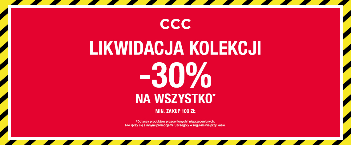 LIKWIDACJA w CCC! -30% na WSZYSTKO przy zakupach za minimum 100zł! Tak na WSZYSTKO. Buty, torebki i akcesoria znanych marek kupisz teraz 30% taniej! Kup, zanim najlepsze modele znikną! Promocja obowiązuje w salonach CCC. Szczegóły w regulaminie